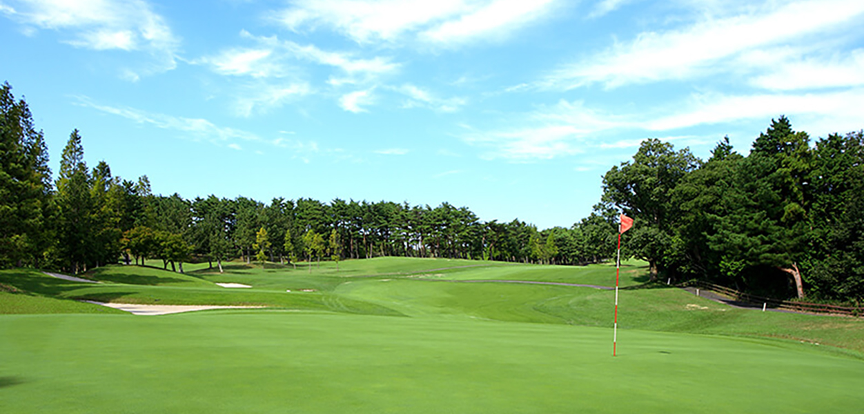 蒲生スマーICから約8分、竜王ICから約15分の場所にある、水と森に囲まれた自然豊かなゴルフ場です。フラットな地形に展開し、樹齢を重ねた赤松で囲まれています。フェアウェイには自然のうねりが走り、木立も点在し、さらに大小の池がハザードとして巧みに取り入れられたレイアウトとなっています。