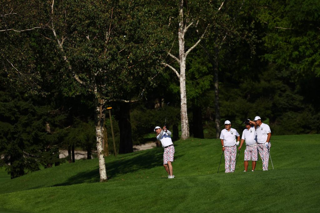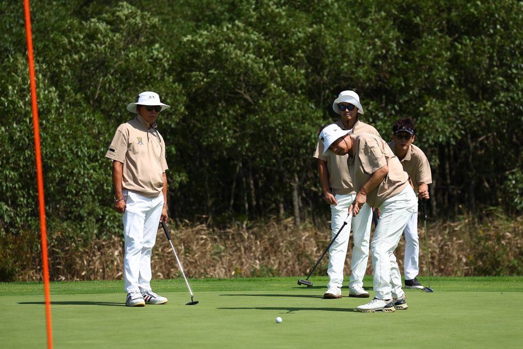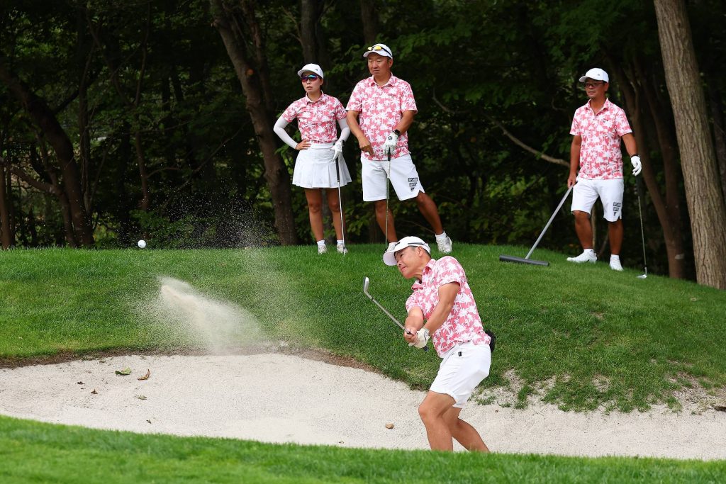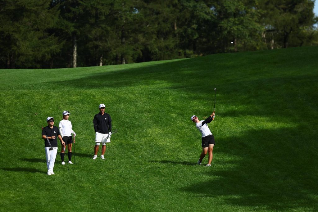 積極的にピンを狙う選手のみなさん。普段はセーフティに打つことが多いと思いますが、パーじゃなくてバーディーを獲るためには攻めるしかありません。
