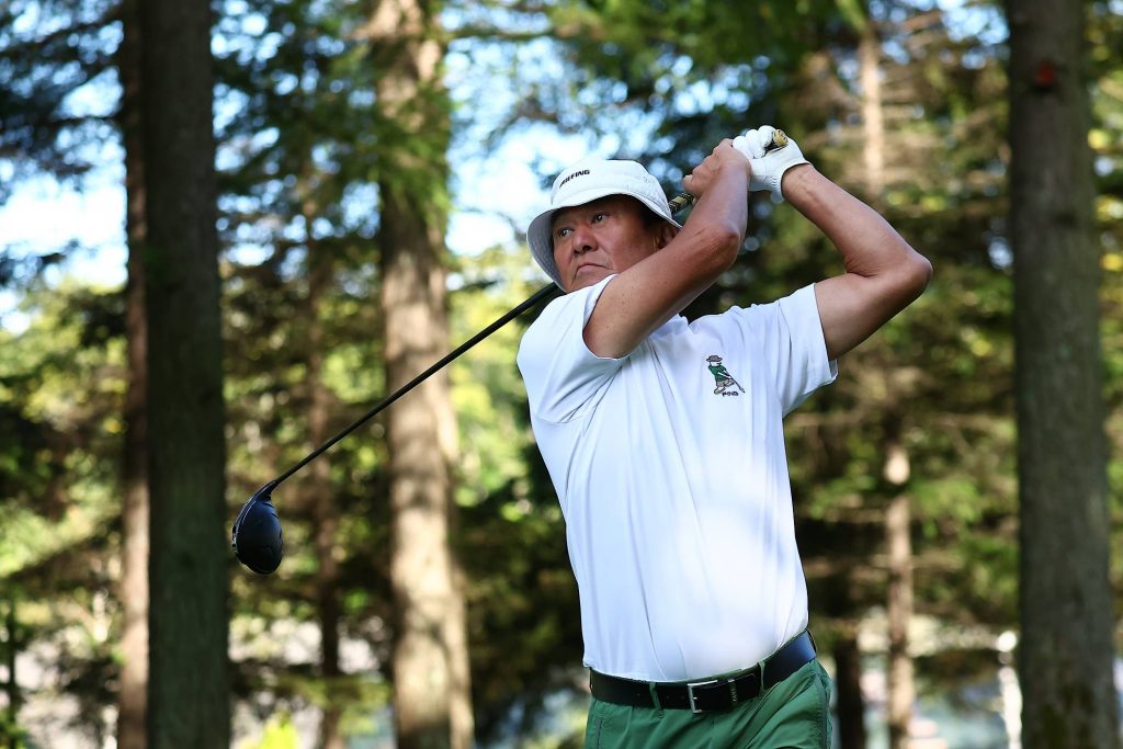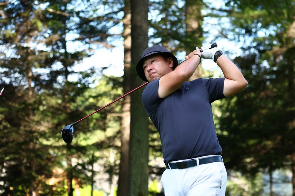 男性選手は青ティを使用してティオフ。飛ばしてナンボのブルークラスですが、しっかりボールをコントロールしないと枠に収まりません。