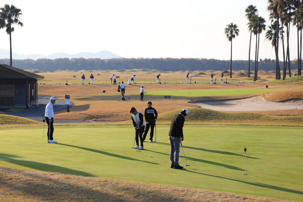 クラブハウス前のパッティンググリーン。チームプレーの仕上げとなるパターは直前のシミュレーションが欠かせません。
