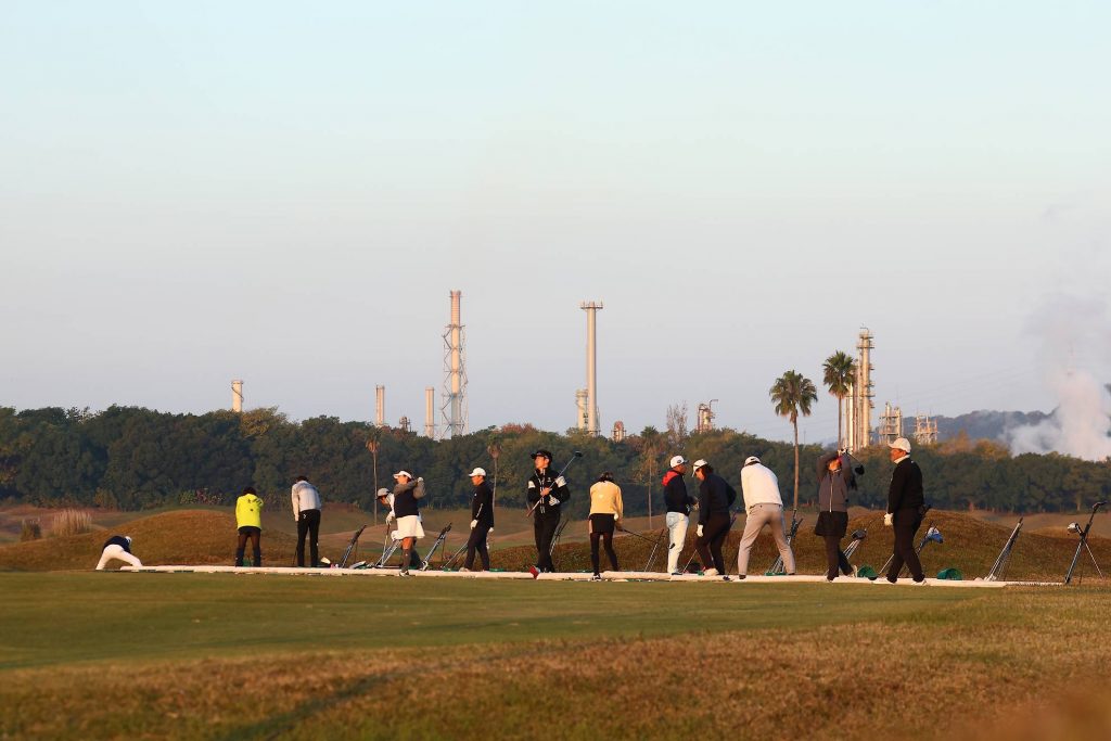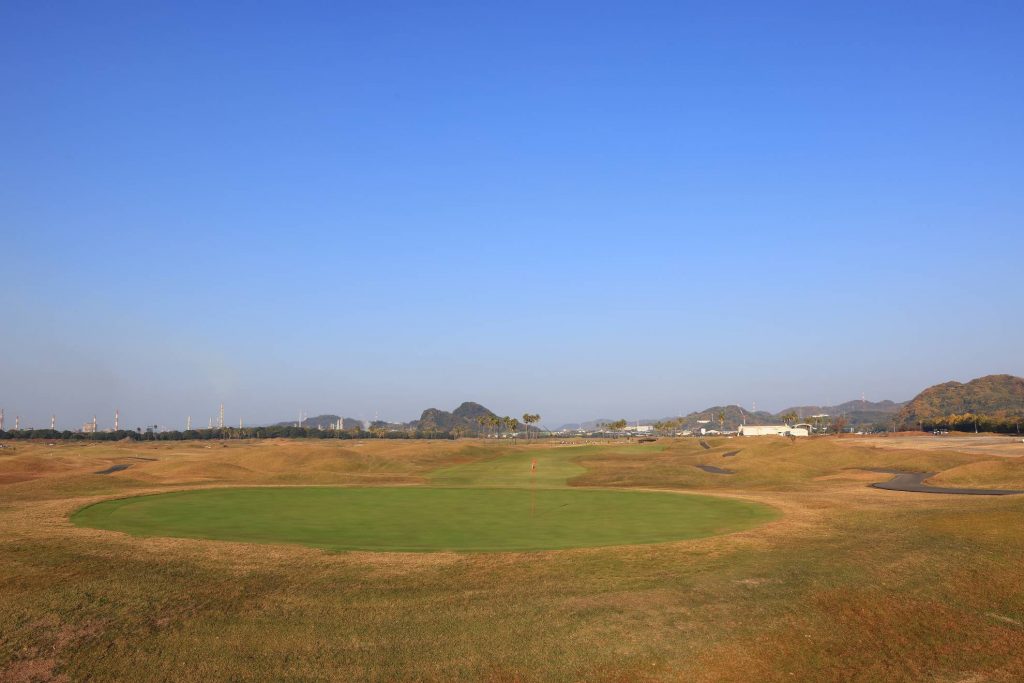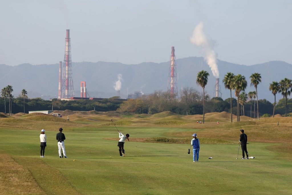 試合会場は「JFE瀬戸内海ゴルフ倶楽部(岡山県笠岡市)」です。ご覧のようにとにかく見通しのいいコース。左に見える煙突群はJFEスチールの製鉄所。朝から活気が感じられる光景ですよね。