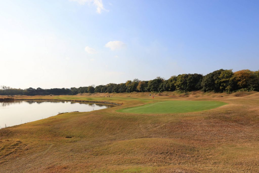 ピンは池越えの先に。まさしくプロテスト最終日の位置に立っています。