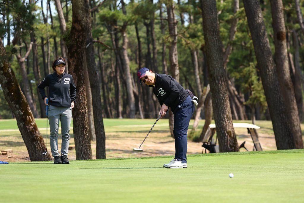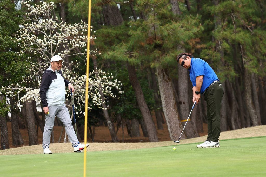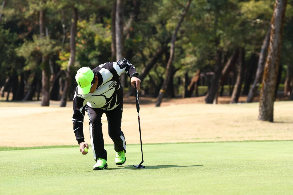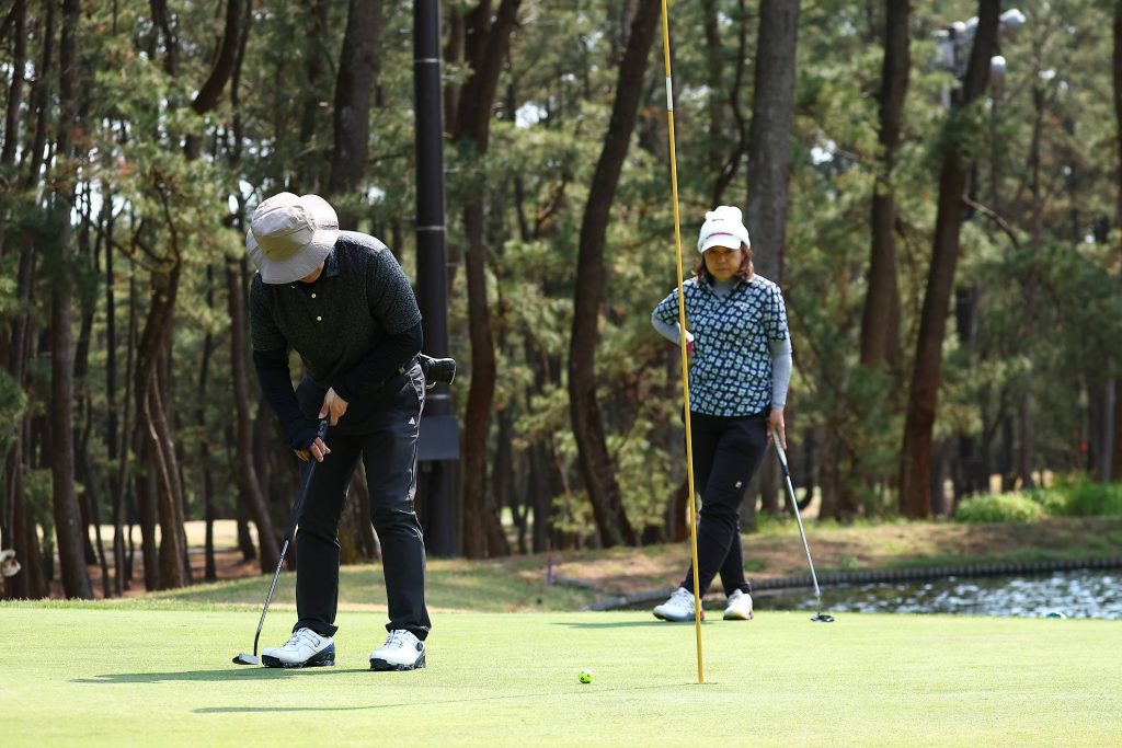 続いてパター。セルフなのでクラブの準備もチームプレーの範囲内です。