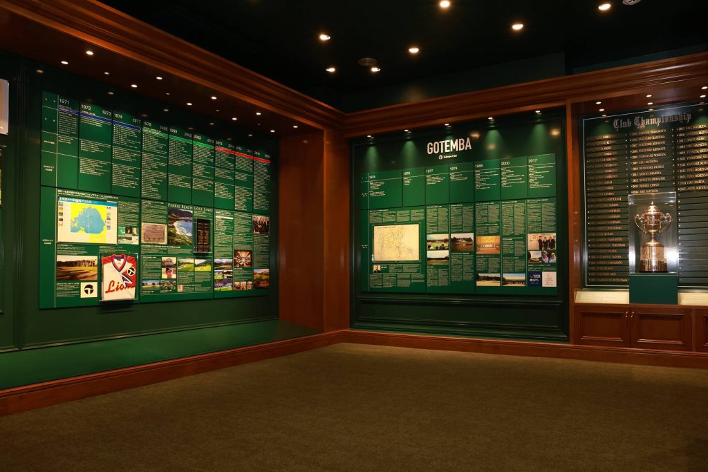 クラブハウスの展示コーナーでは御殿場コースの歴史が学べます。スタート前にモチベーションを上げるのにちょうどいいスポット。18番ホールに池が追加されたのは1983年だったんですね。