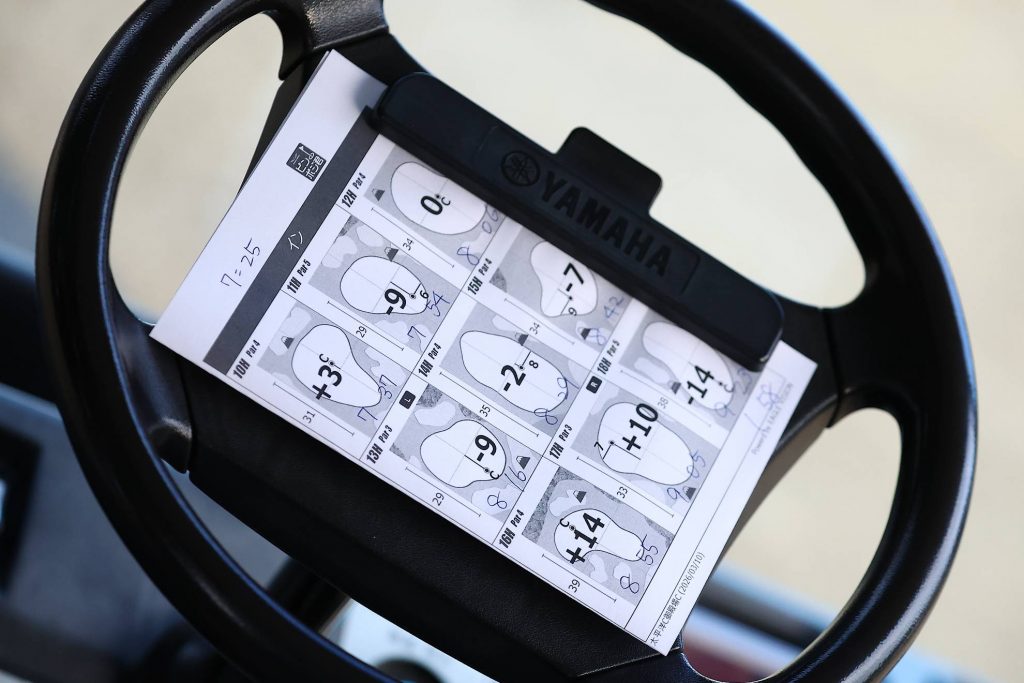 本日のピンポジションはこちら。よくわからないときはコースを知り尽くしているキャディさんに聞きましょう。