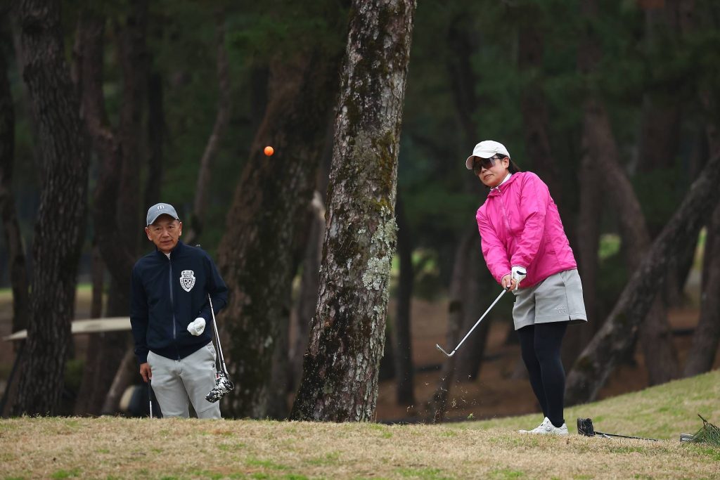 まずは夫婦ダブルス戦のスタートを見てみましょう。フェアウェイから先がキュッと狭いコース。両サイドの松林には要注意です。
