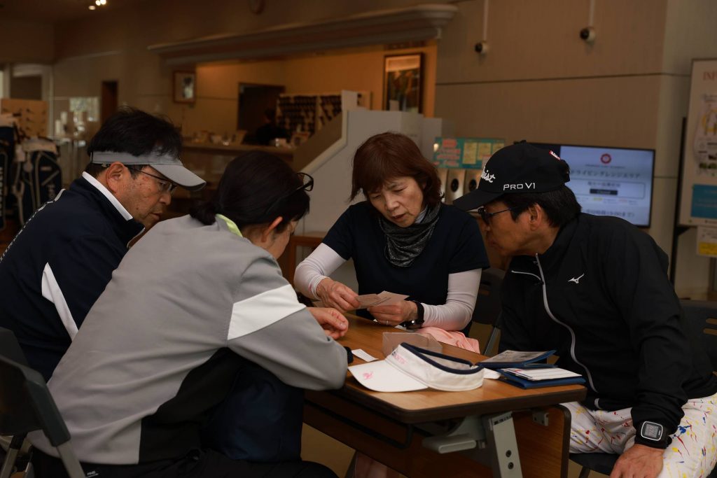 クラブハウスのアテストエリアでスコアチェックを。間違いがないかどうかペア同士で確認します。