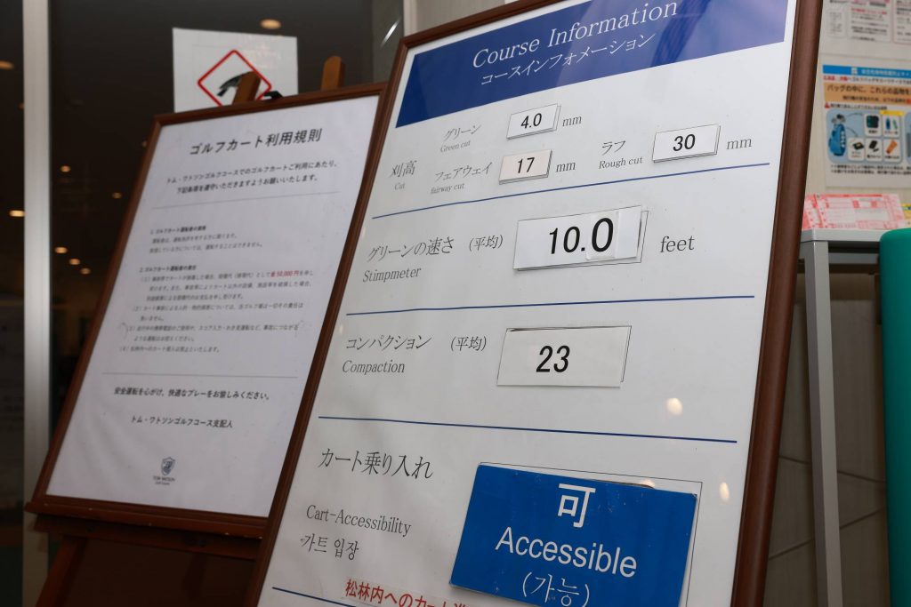 コースに出る前にグリーンコンディションを確認。そしてカート乗り入れ可。ボールが二手に分かれやすいダブルスには好都合です。