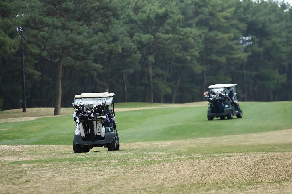 2人乗りカートなのでご夫婦ごとに移動開始。足で走ってボールをピックアップする必要がないためラクラクスピーディー!
