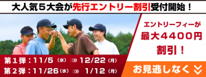 「全国決勝に行きたい!」というみなさんにおすすめの大会です。3ステージ制の「第4回ゴルフライフスクランブルゴルフ選手権2023」は1stステージから2ndステージへのルートを自由に選べるのが魅力。得意そうなコースを選び抜き、福岡と熊本で行われるFinalステージ進出を決めましょう! エントリーは早めがお得!コー…